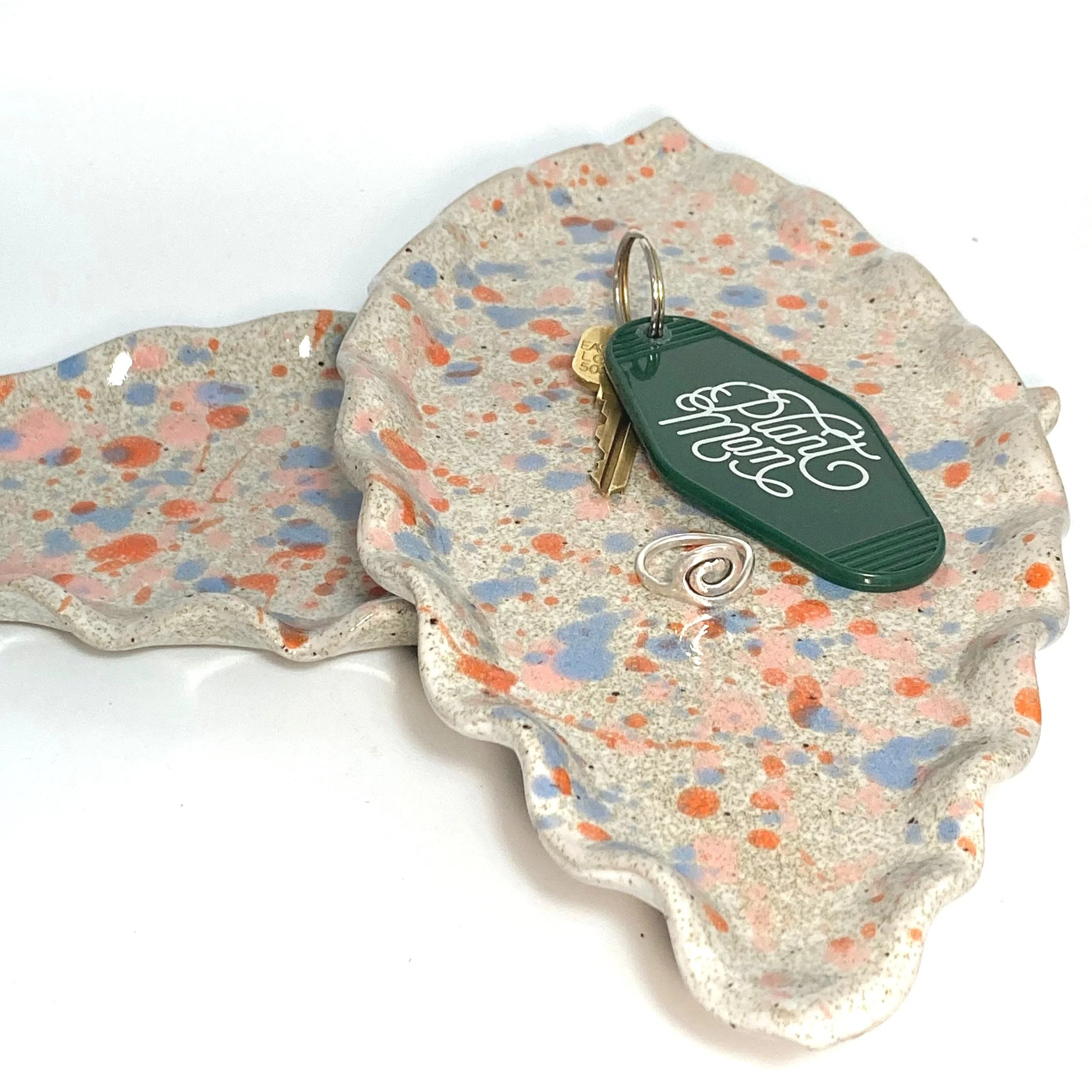 This bright ceramic platter is handmade with reclaimed clay and glazed in my signature sprinkle cake style. This gorgeous platter will add a pop of color to your coffee table or nightstand. Or the food safe dish is perfect as an appetizer platter for your next dinner party. Available in 10.5 or 11.5 inches in length. Use alone or create a set with the Pink and Sherbert Ripple Platters!
