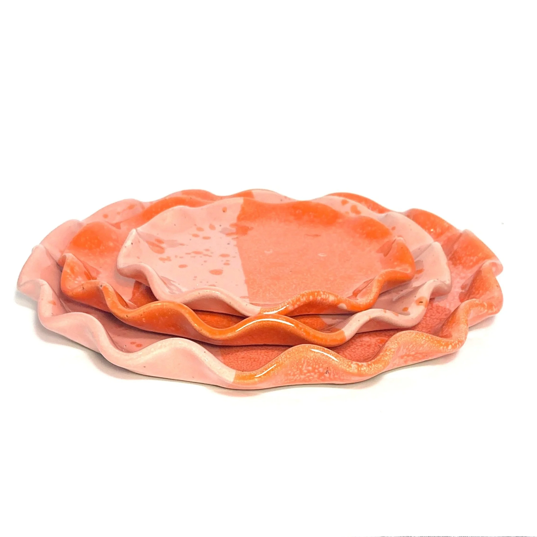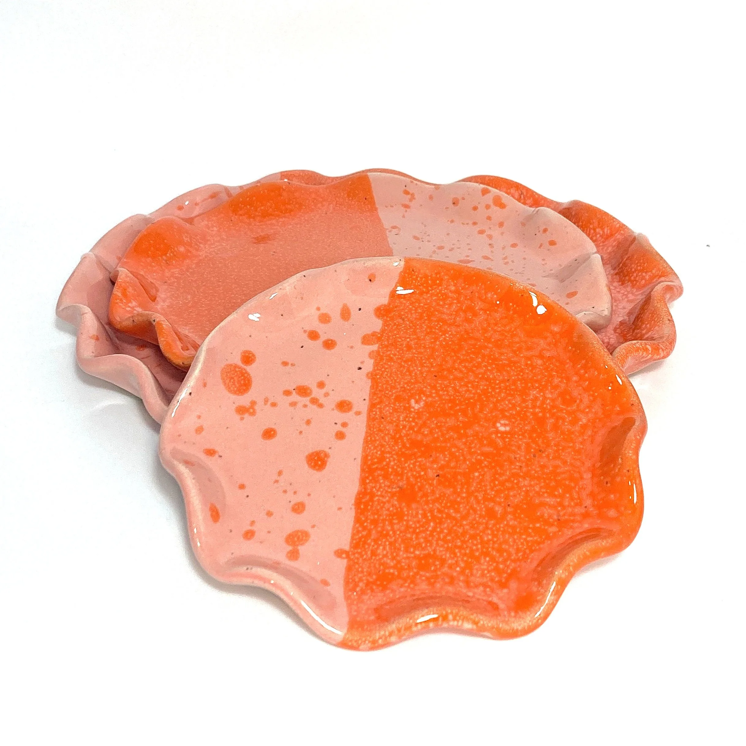 A food safe ceramic plate built from reclaimed clay and glazed with glossy pink and orange glazes. Available in 5, 7, or 9 inch diameter size. Each plate is hand-built from a slab of clay with a hand-shaped rim. Add a pop of color to your kitchen cabinet or mount on your wall for some vintage decor.